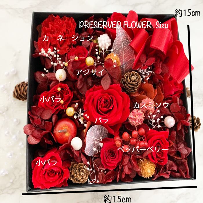 プリザーブドフラワーを使用しておりますので、水やりなのどお手入れは不要です。色褪せしてしまうので直射日光・強い光を避けてください。また高温多湿を避けてください。ホコリが付いた場合は毛先の柔らかい筆などで優しく払い落としてください。