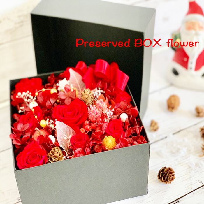 クリスマスフラワーボックスデザイン (プリザーブドフラワー) xmasイメージでボックスに沢山のお花を詰め込みました。貰った方も贈った方もボックスを開けた瞬間喜び・幸せが溢れ出す。 令和元年初のxmas!!